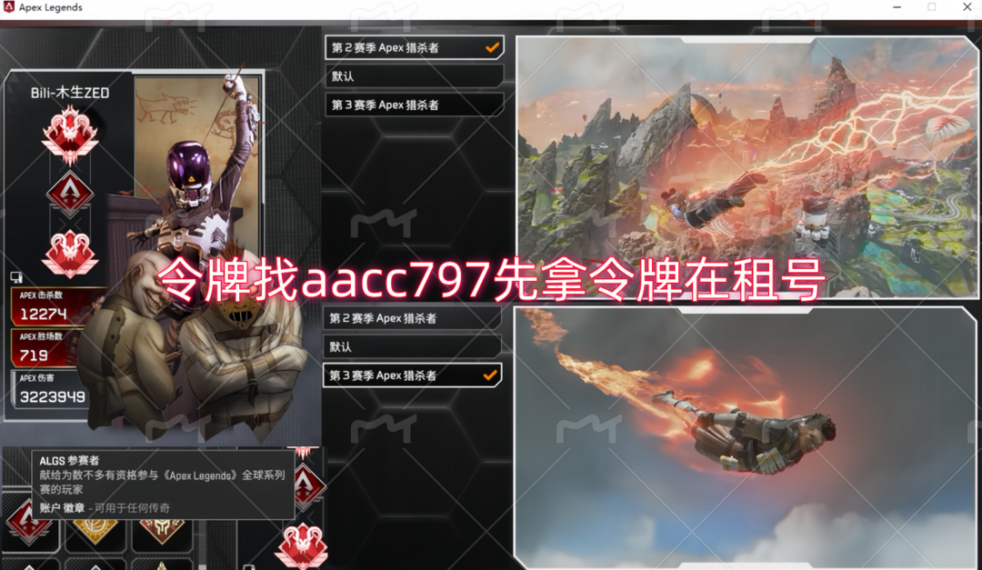 先拿令牌在租号,备用令牌在第一张图片上,人不在的话,租了也无法登录上,❤️请不要使用辅助和手柄,一旦使用手柄必封号❤️已在河南省郑州市律师事务所备案,描述太多,基本该满的都满了!❤️游戏ID可以更改❤️禁用手柄,手柄直接封号,,❤️如果人不在的话,不拿令牌,你就算下单也无法上号的-❤️❤️ 网吧用户租号前请在电脑.上面用小号玩1小时以上测试电脑是否存在机器码。有机器码账号会在1小时左右永久封禁。------❤️S2 S3双猎杀尾气❤️algs标半决赛冠军❤️散热器零点寒霜墓碑血石寒霜❤️394金皮❤️(除了刀刃没,其他基本都全了)❤️3传万杀恶灵苦无、罗芭、亡灵......绝版皮肤基本该有的都有了!