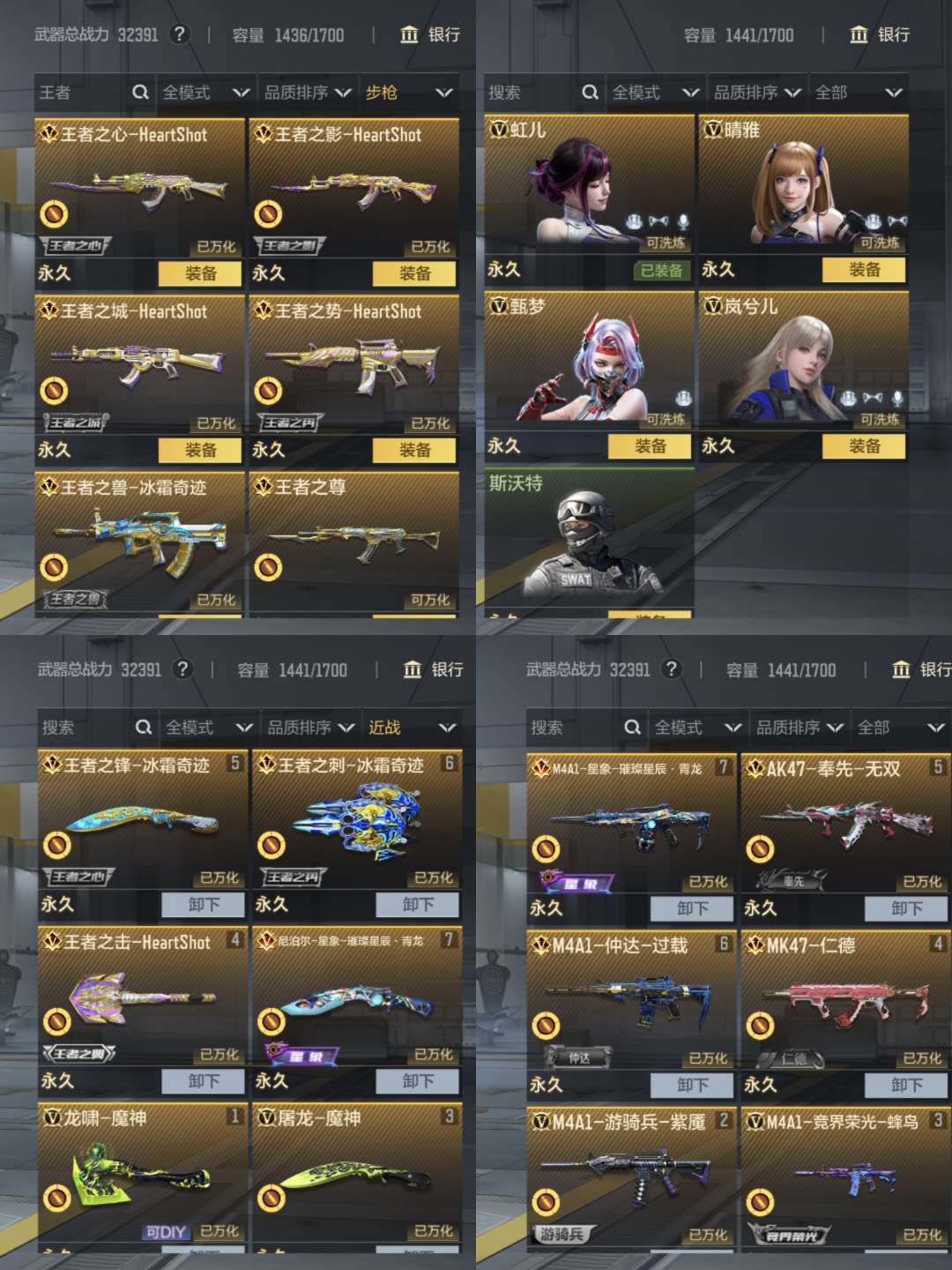 兄弟们王者武器音效卡消灭音效命中特效都有的,3个女团角色加甄梦,防闪都刷好了